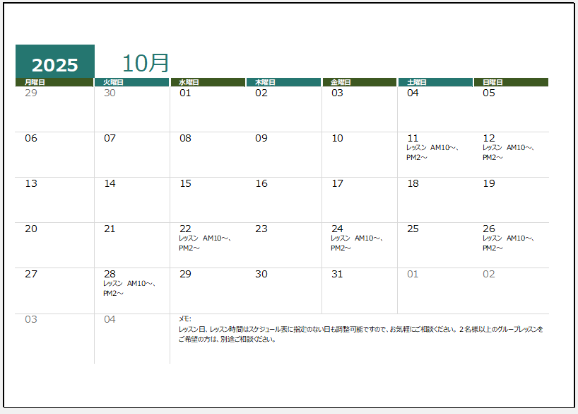 2025年10月1日 / 最終更新日 : 2025年10月1日 bianca お知らせ レッスンスケジュール(10月) 10月のレッスンスケジュールが決まりました。 レッスン日、レッスン時間は、スケジュール表に指定のない日も調整可能です。お気軽にご相談ください。 1回のレッスンは、2名様までです。 2名様以上のグループレッスンをご希望の方は、別途ご相談ください。 よろしくお願いいたします。 アトリエビアンカは、少人数制の陶絵付け教室です。随時生徒を募集しています。お気軽にお問合せください。 柏駅徒歩5分 ℡ 04-7113-1620