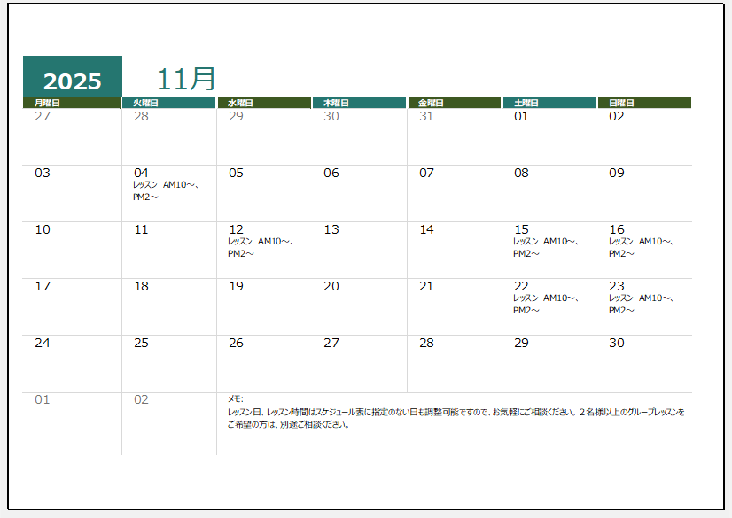 2025年10月31日 / 最終更新日 : 2025年10月31日 bianca お知らせ レッスンスケジュール(11月) 11月のレッスンスケジュールが決まりました。 レッスン日、レッスン時間は、スケジュール表に指定のない日も調整可能です。お気軽にご相談ください。 1回のレッスンは、2名様までです。 2名様以上のグループレッスンをご希望の方は、別途ご相談ください。 よろしくお願いいたします。 アトリエビアンカは、少人数制の陶絵付け教室です。随時生徒を募集しています。お気軽にお問合せください。 柏駅徒歩5分 ℡ 04-7113-1620